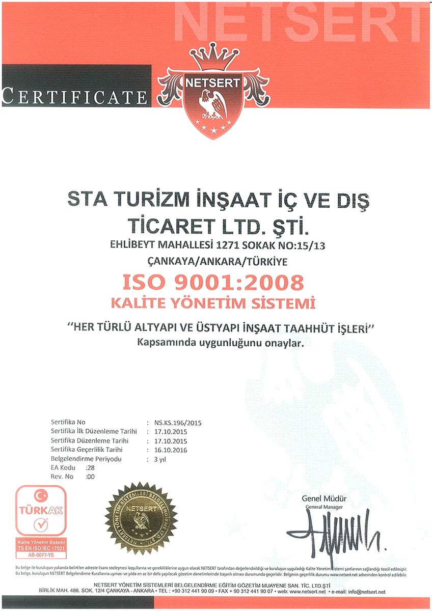 Tüm faaliyetlerini ISO 9001 kalite yönetim sistemini esas alarak yürütmekte olan STA İnşaat, mükemmel sonuçlara ulaşabilmek için müşterilerinin ve çalışanlarının beklentilerini her zaman ön planda tutmuştur. Geçmişindeki büyüme ivmesini, önümüzdeki yıllarda da artırarak sürdürme kararlılığında olan STA İnşaat, deneyimli kadrosuyla, yapımda ve yönetimde kaliteden taviz vermeme ilkesini devam ettirerek, taahhüdü altındaki işleri gereken standartlarda yapmaya devam edecektir.